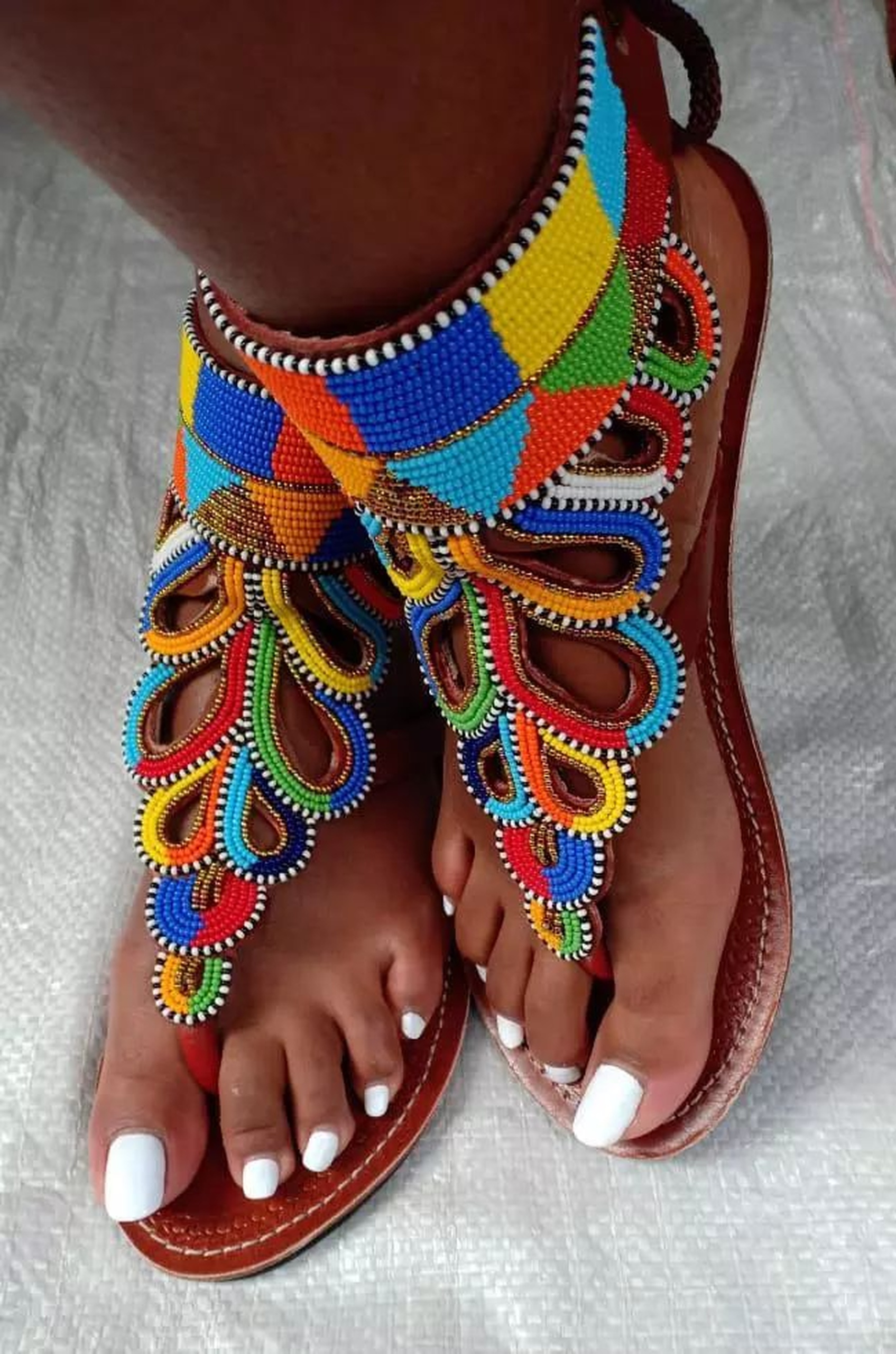 The upper section is adorned with carefully stitched beadwork in vibrant tones including blue, red, yellow, green, orange, and white. In addition, the layered teardrop-shaped bead designs create a cascading effect across the top of the foot, making the sandals visually striking. The bold color combination reflects traditional African craftsmanship while maintaining a modern aesthetic.