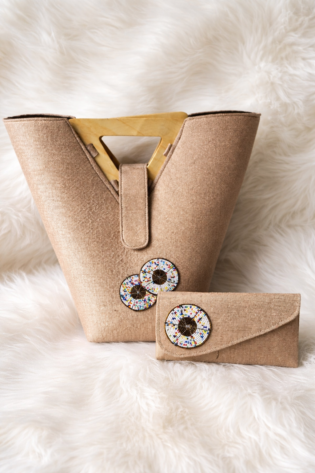 The handbag features a bold structured silhouette complemented by geometric wooden handles that introduce a natural, contemporary element. In addition, the circular beadwork accents create visual interest while maintaining a clean and balanced design. The neutral linen fabric enhances its versatility, allowing the craftsmanship to stand out without overwhelming the overall aesthetic. Because the beadwork is handcrafted, each set carries slight variations in detail, making every piece unique.